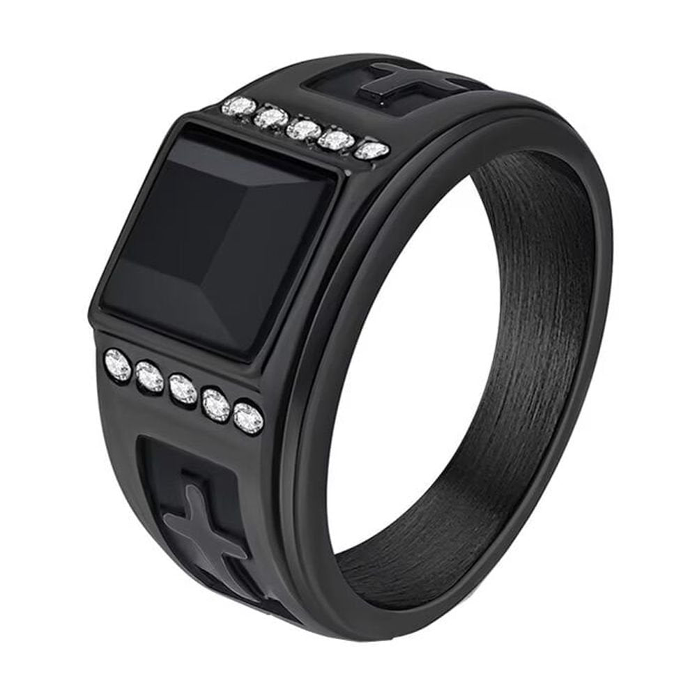 HIJONES Men's Stainless Steel Black Square Gemstone Silver Zirconia Signet Ring