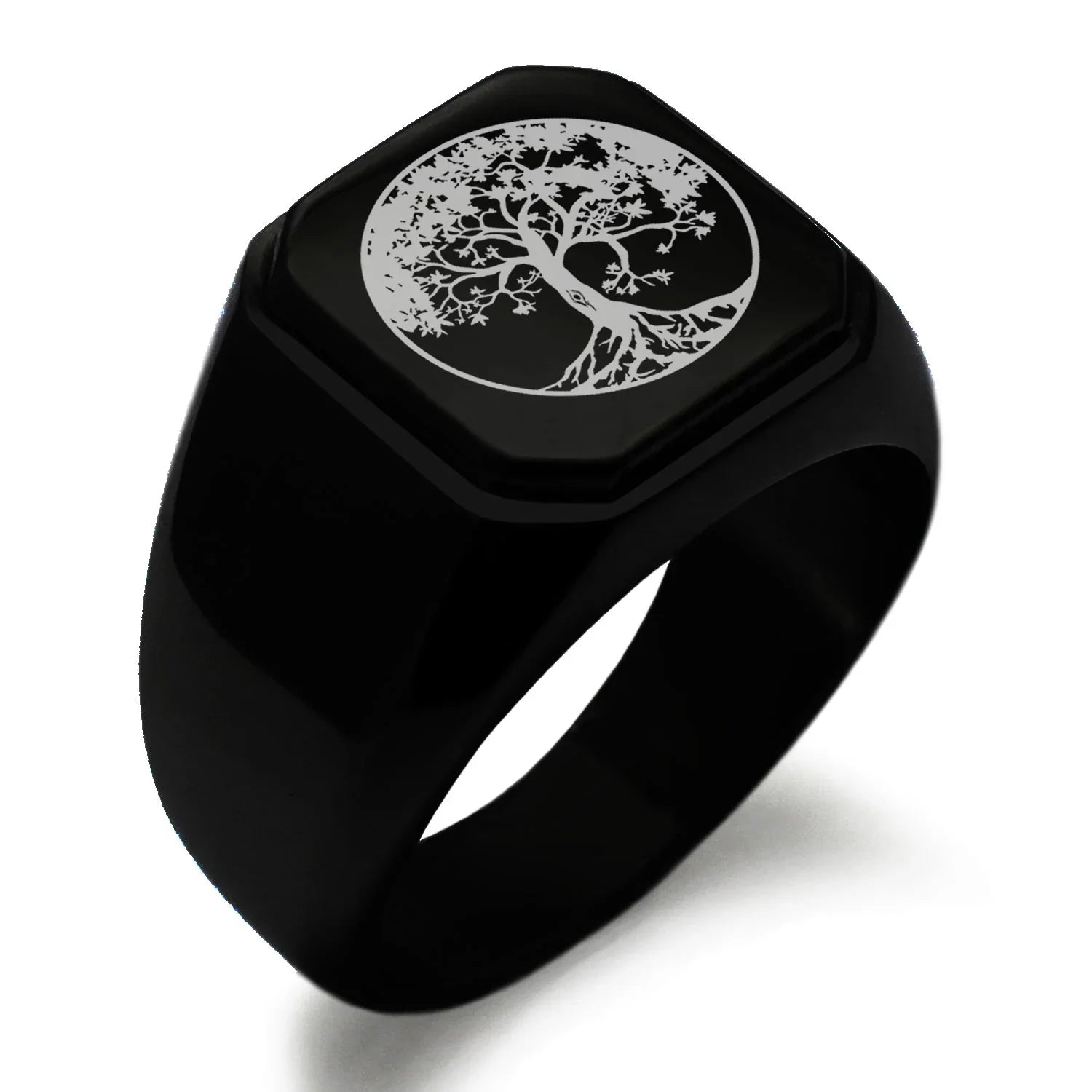 Stainless Steel Tree of Life Engraved Square Flat Top Biker Style Polished Signet Ring